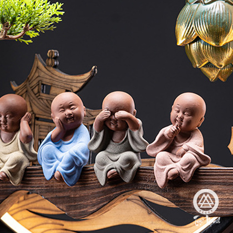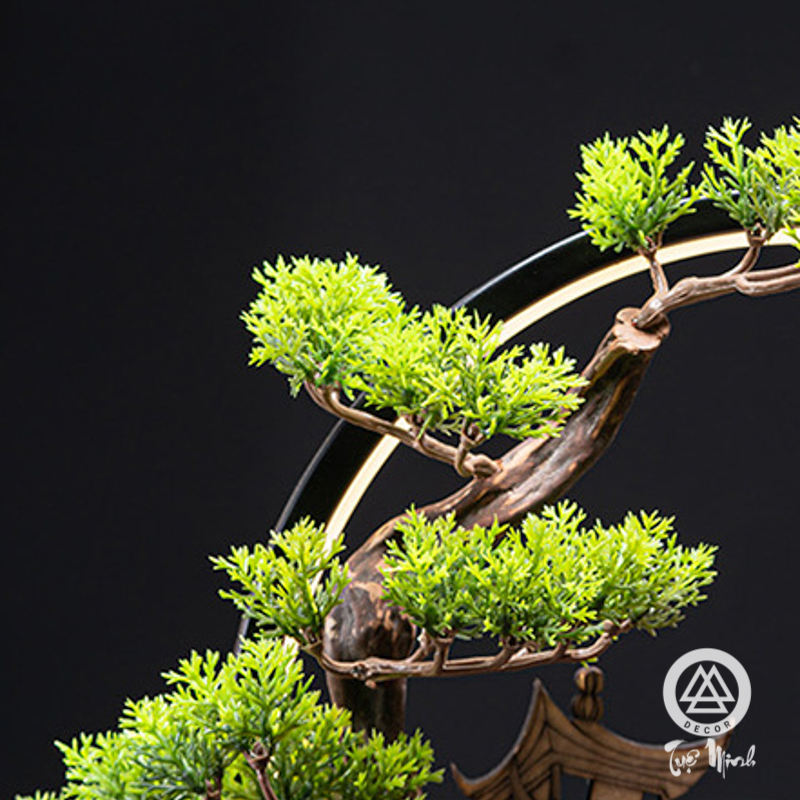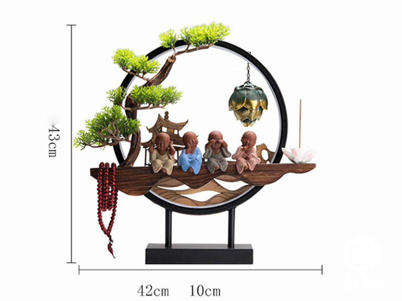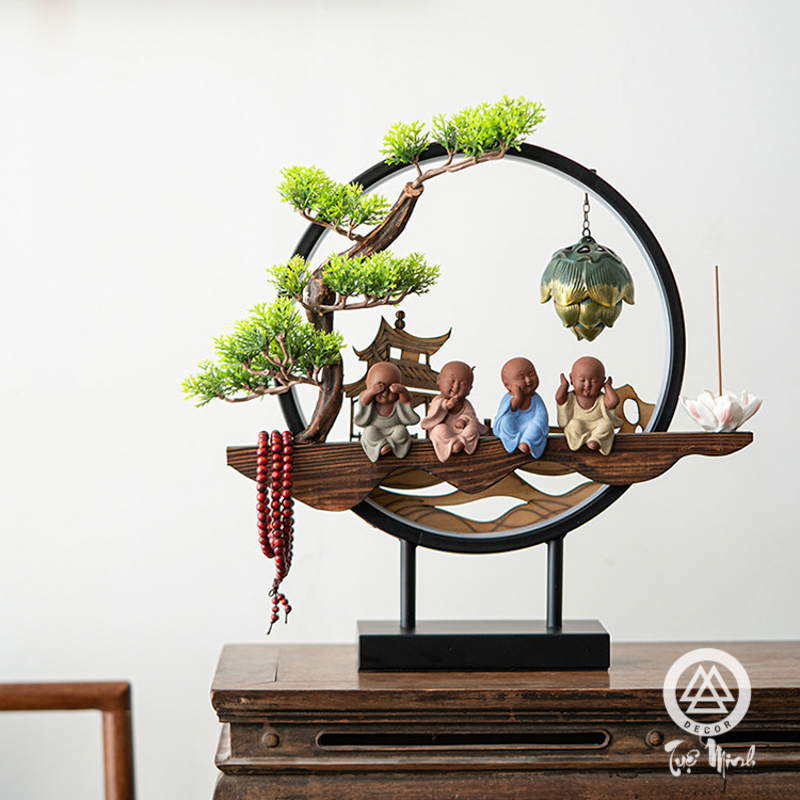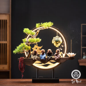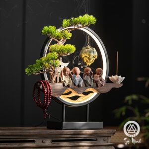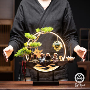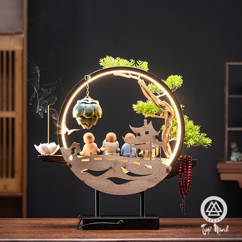 Sản phẩm bao gồm: Đèn đế, lư treo, tượng trang trí, vòng gỗ, hoa sen, cành cây giả