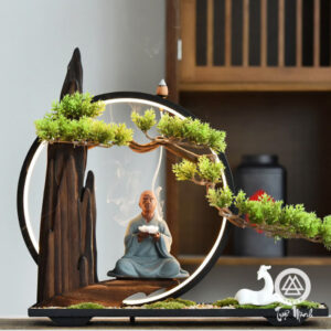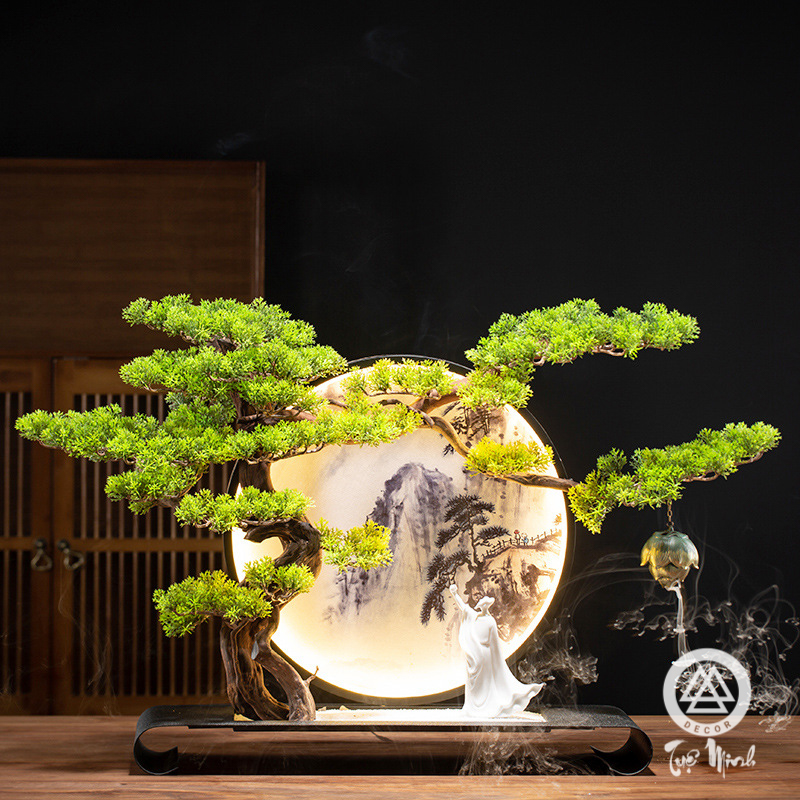 Tiểu cảnh thác khói trầm hương đối tửu nghinh ca khánh tùng thường được trang trí trong phòng khách, phòng làm việc, cửa hàng, phòng thiền, bàn trà